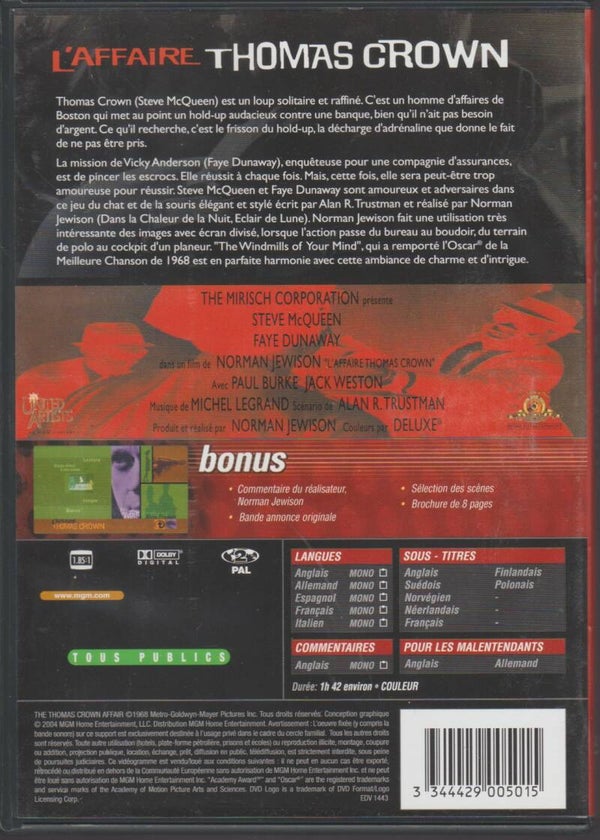 L'affaire Thomas Crown Dvd 1968 (MR1) Steve McQueen Norman Jewison Faye Dunaway